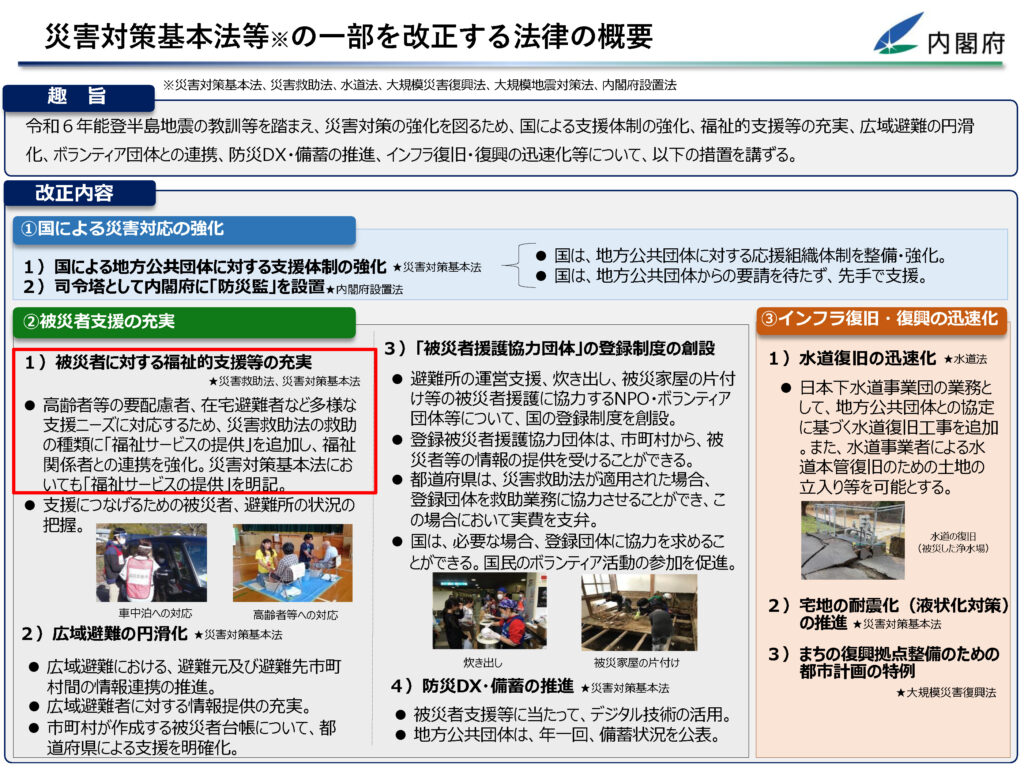 令和6年能登半島地震の教訓等を踏まえ、災害対策の強化を図るため、国による支援体制の強化、福祉的支援等の充実、広域避難の円滑 化、ボランティア団体との連携、防災DX・備蓄の推進、インフラ復旧・復興の迅速化等について、以下の措置を講ずる